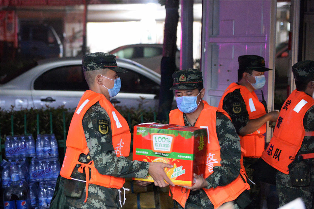 2020年7月20日凌晨,在位于蒙洼蓄洪區(qū)內(nèi)的老觀鄉(xiāng)老觀村,武警安徽總隊阜陽支隊的官兵幫助一家超市轉(zhuǎn)移貨物。